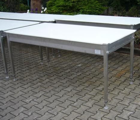 - Rohrrahmentische mit Edelstahl-Tischplatten oder mit PE-Platten in unterschiedlichen Stärken und Farben